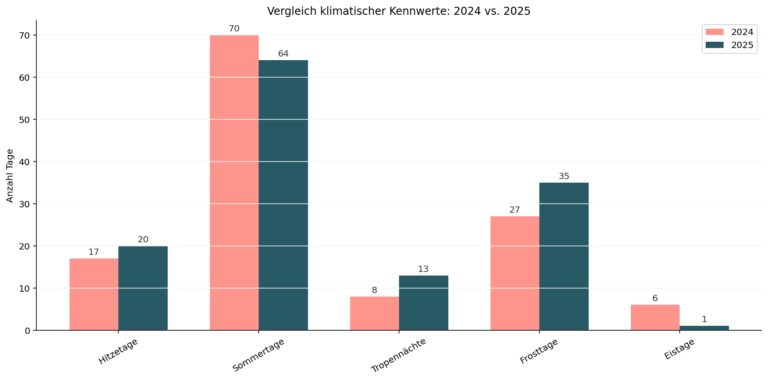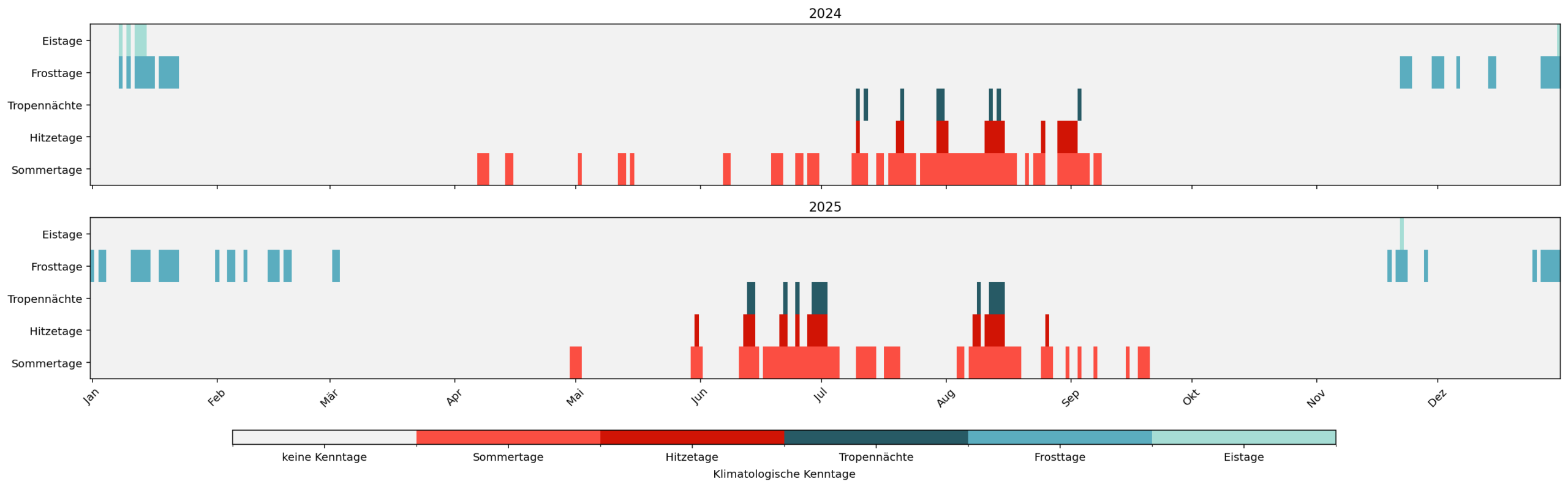 Wir geben Einblicke in die klimatologischen Kenntage 2024 und 2025, basierend auf strahlungskorrigierten Temperaturmessungen unserer Wetterstation (Vaisala WXT) direkt auf der Dachterrasse unseres Büros am Bahnhof Basel SBB.